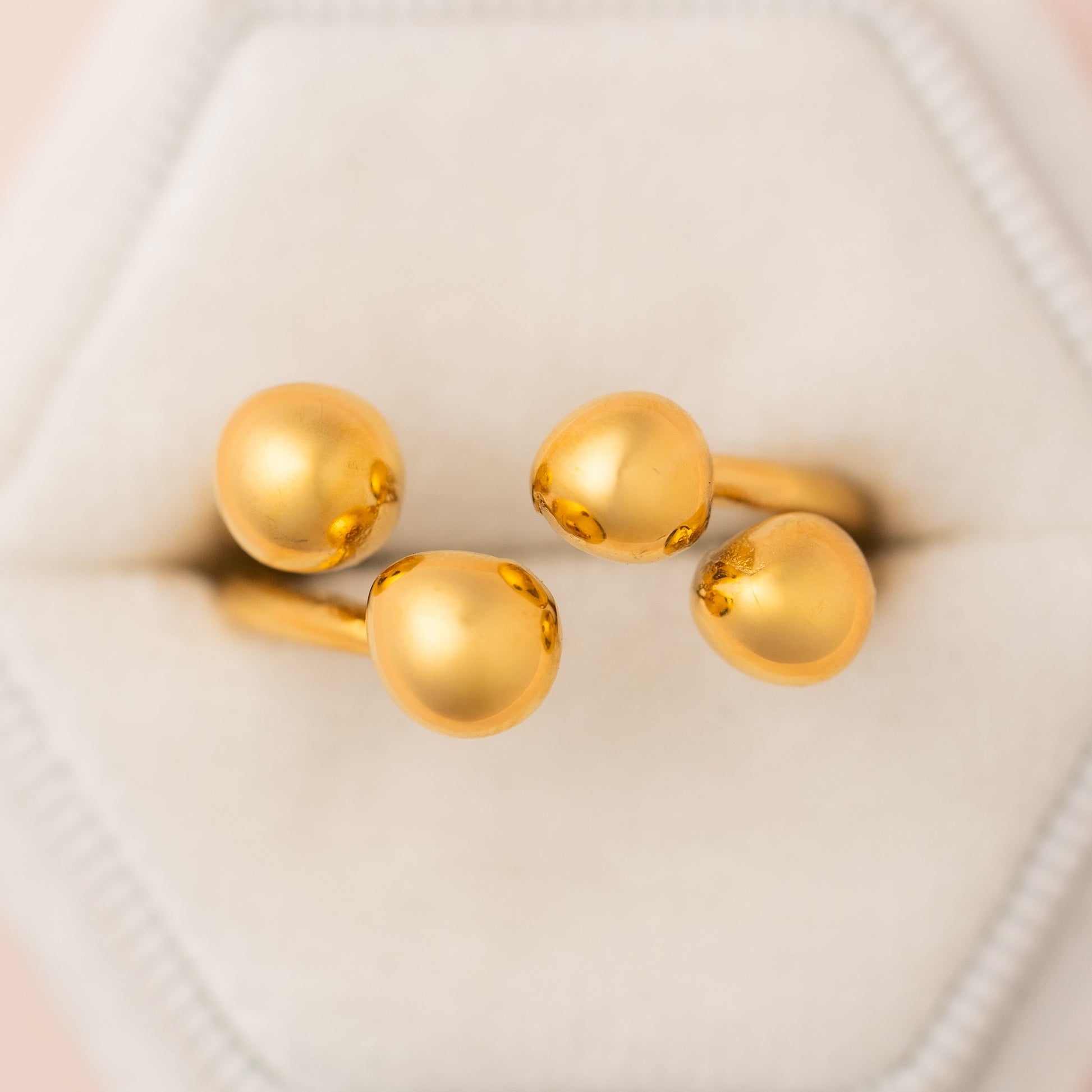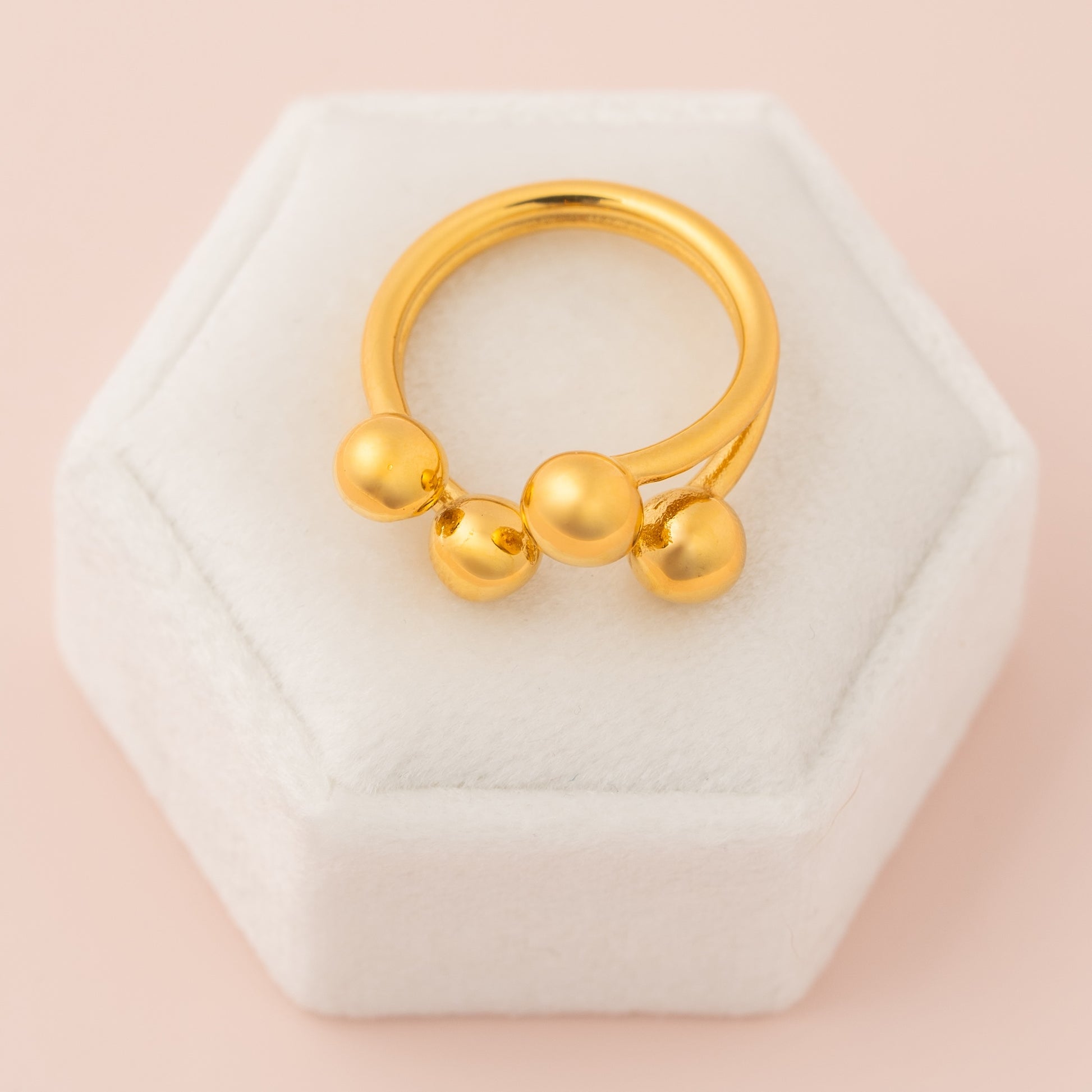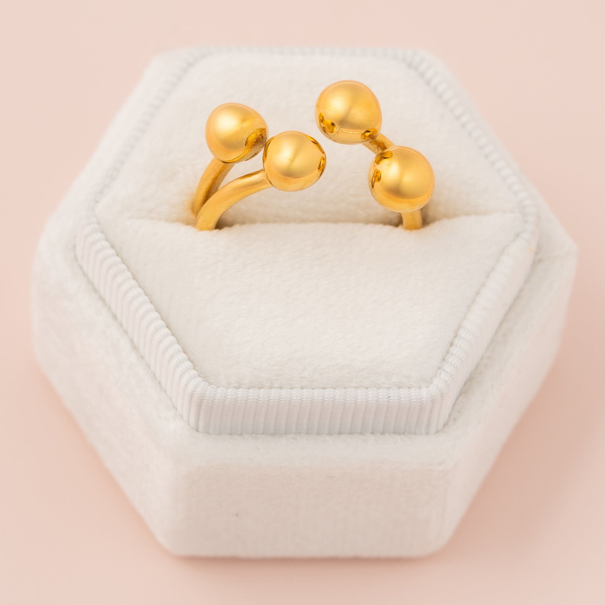 Make a confident statement with our Alexis ring. This modern and edgy piece features a unique open-ended design, adorned with two sets of polished gold-toned spheres. Crafted from durable stainless steel and finished with an 18K gold coating, it offers both exceptional style and lasting quality. Perfect for those who love to stand out!