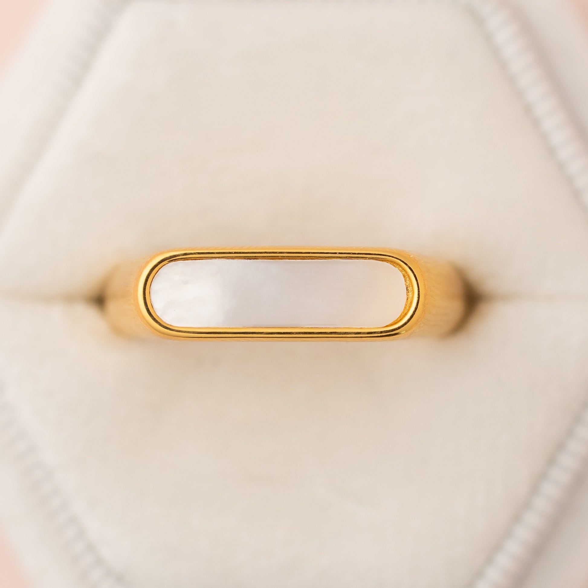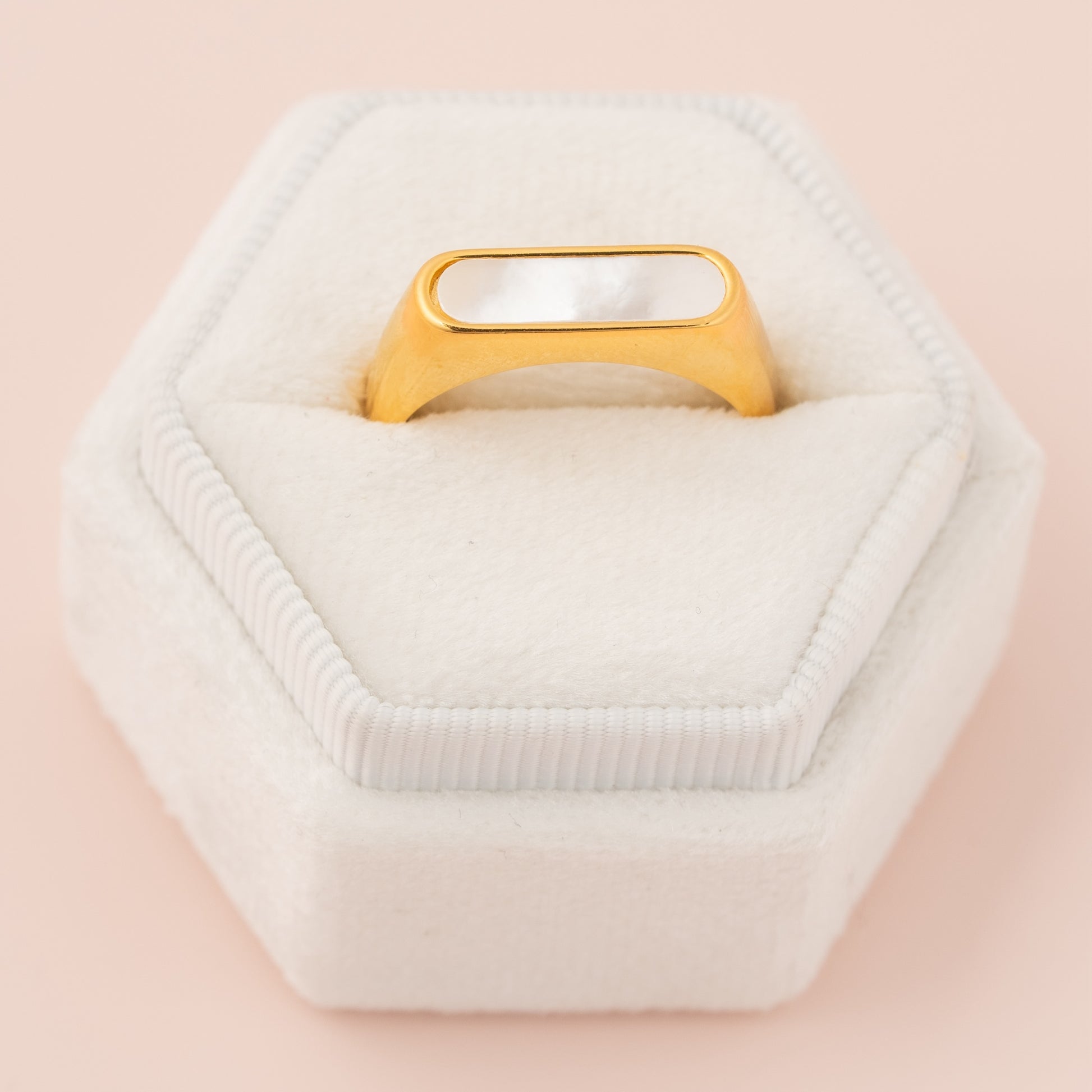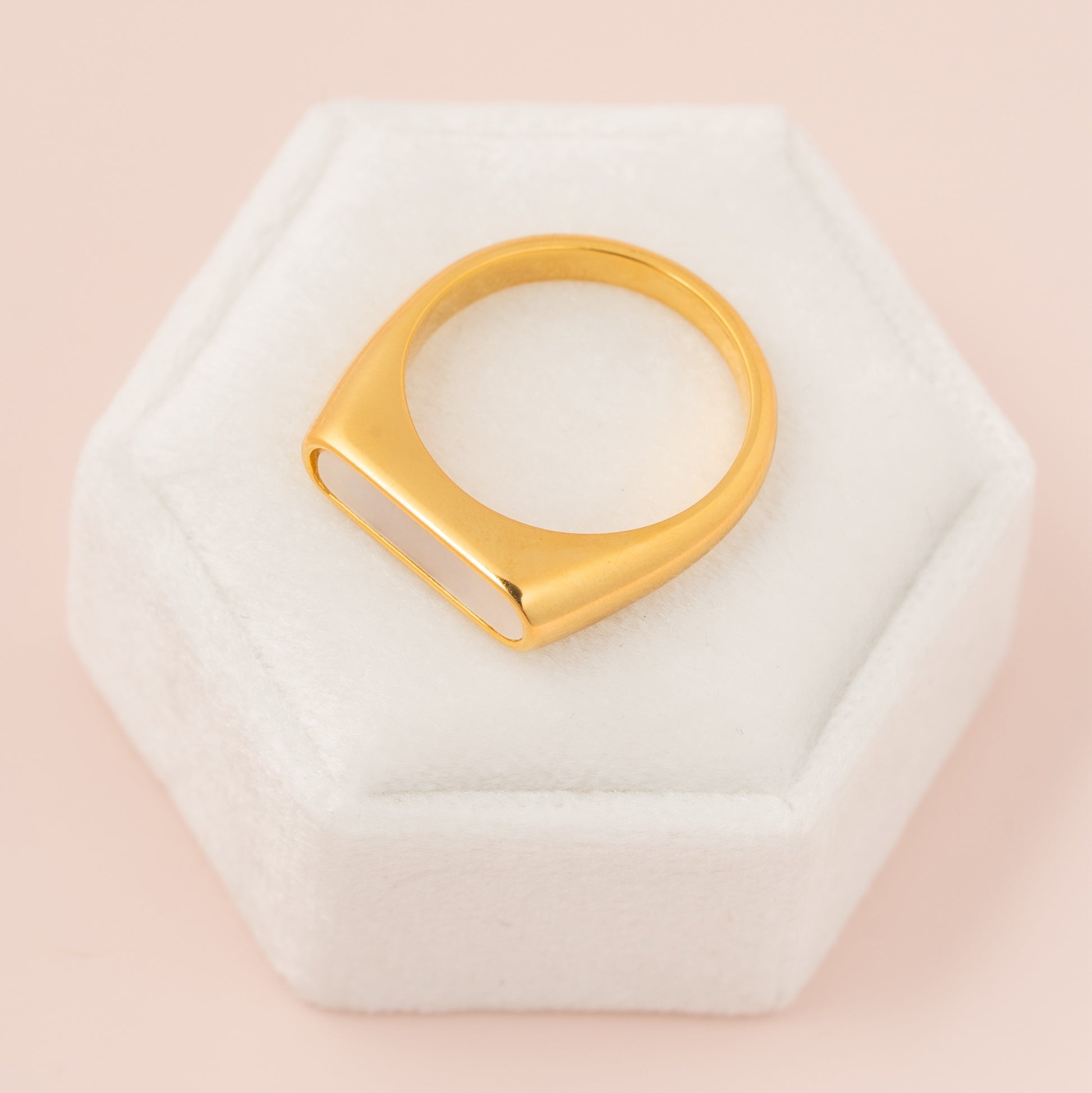 This sleek signet style features a rectangular inlay of luminous, faux mother of pearl set in a polished gold band. Clean lines and soft shimmer make it a go-to piece for everyday sophistication or a subtle statement when you’re dressing things up.