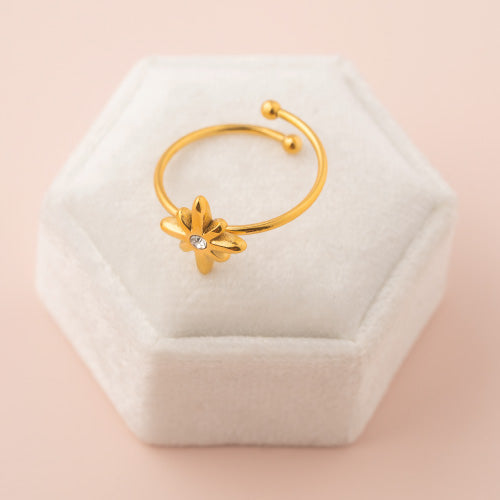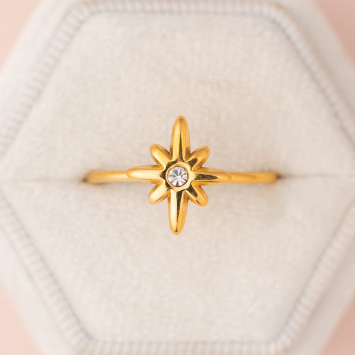 The Helen Ring brings a little sparkle to your stack. With a gold starburst design and a clear cubic zirconia stone in the center, it adds just the right amount of shine. Easy to wear, easy to love!