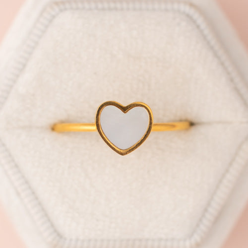 The Lilian Ring features a heart-shaped shell inlay set in a beautiful gold band. Wear it alone or stack it with your favorites. A subtle way to say you’re all heart!