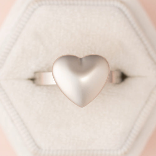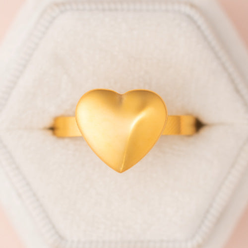 Share your heart without saying a word! The Ruth ring comes in both gold and silver and features a smooth heart on a sleek band. Perfect for everyday wear or a bold little love note, Ruth adds a pop of shine to any stack, or stuns all on her own.