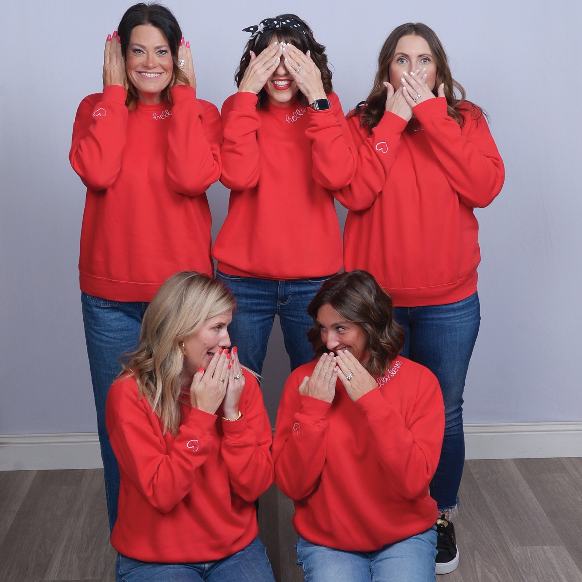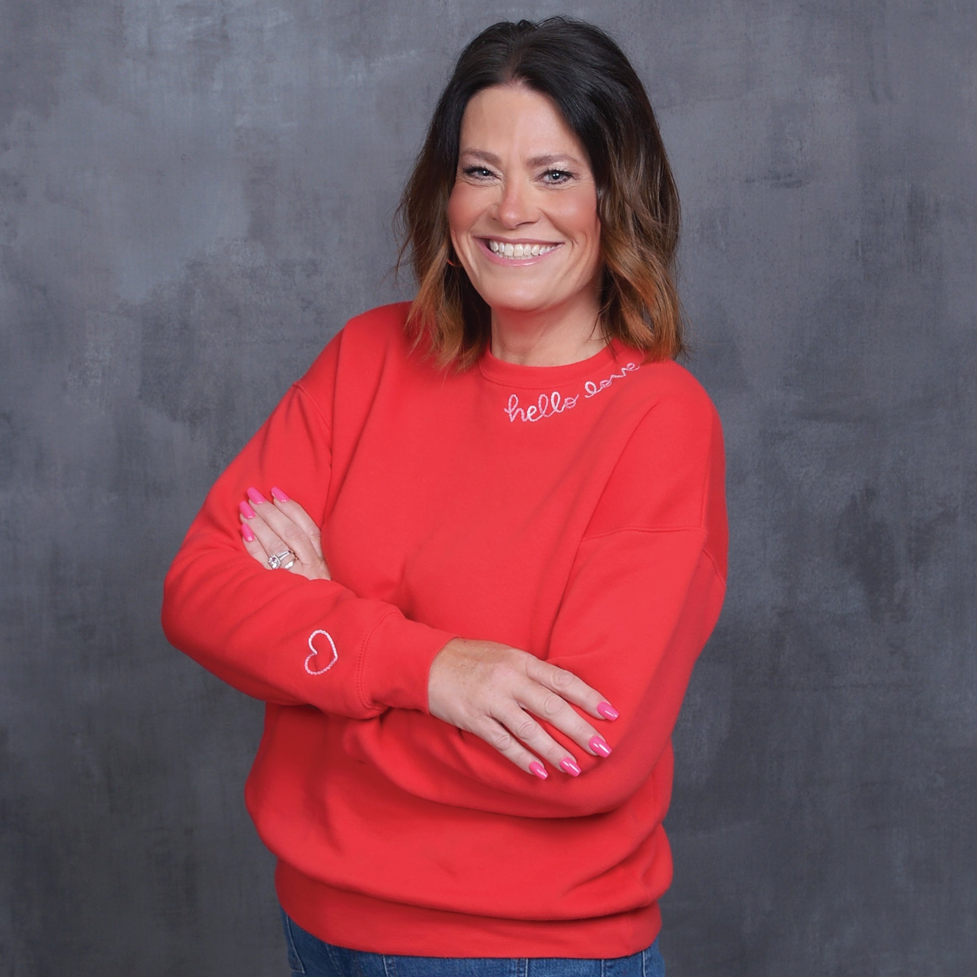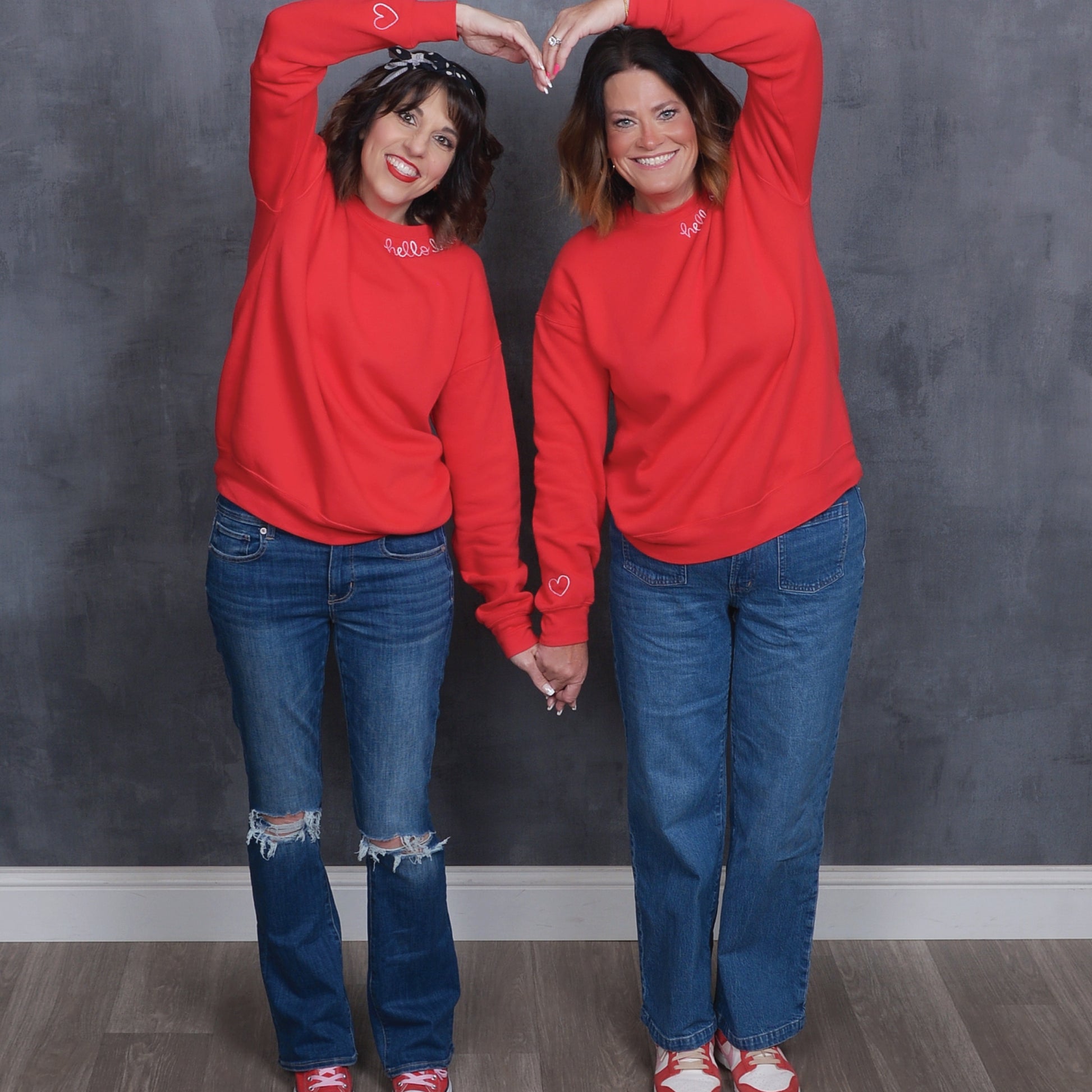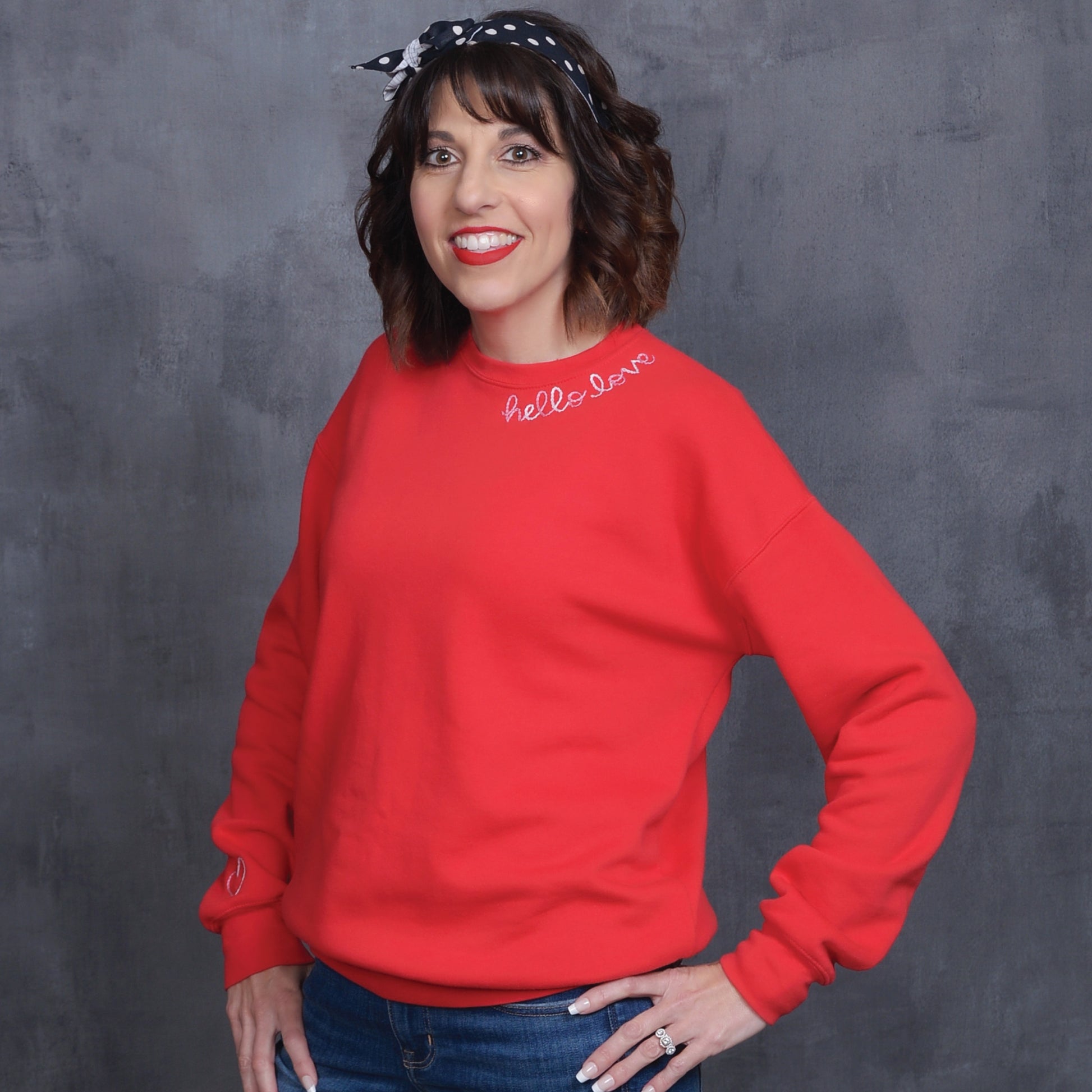Red crew neck sweatshirt with hand embroidered "Hello Love" along the neckline. Pre-shrunk and super soft!