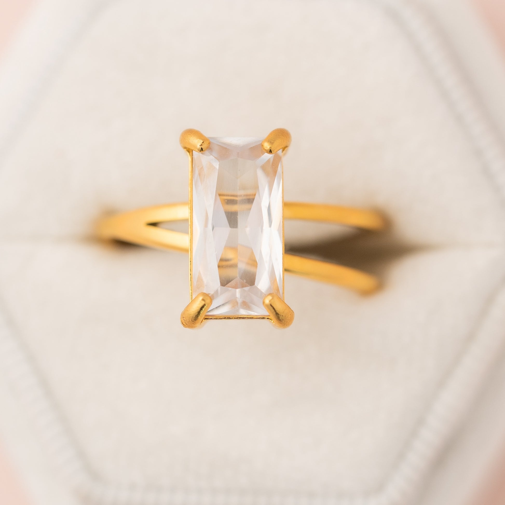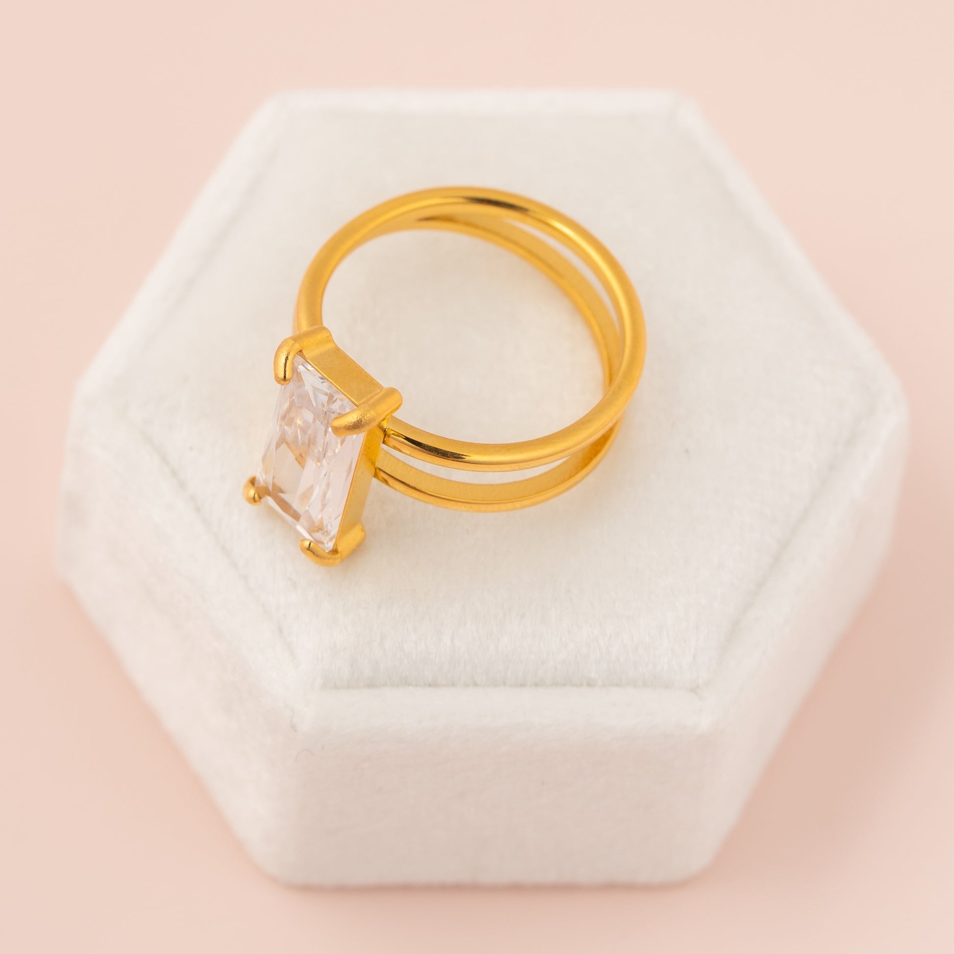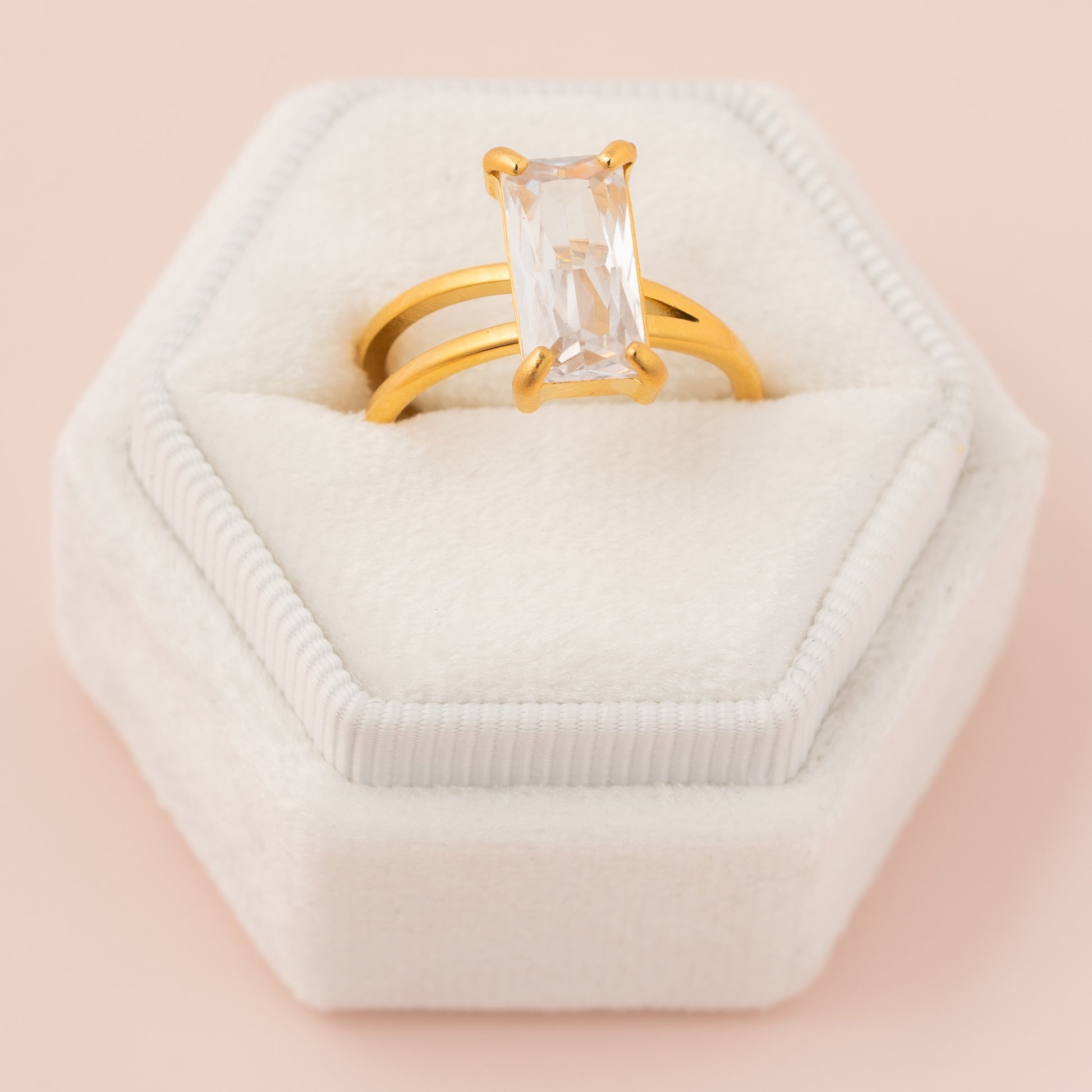 Meet the Jessica ring, a bold take on minimalist elegance. Featuring a dazzling, elongated baguette-cut crystal nestled in a sleek double-band setting, this ring radiates sophistication and sharp style. Its architectural shape and clean lines make it a modern classic — perfect for dressing up or leveling up your everyday look.