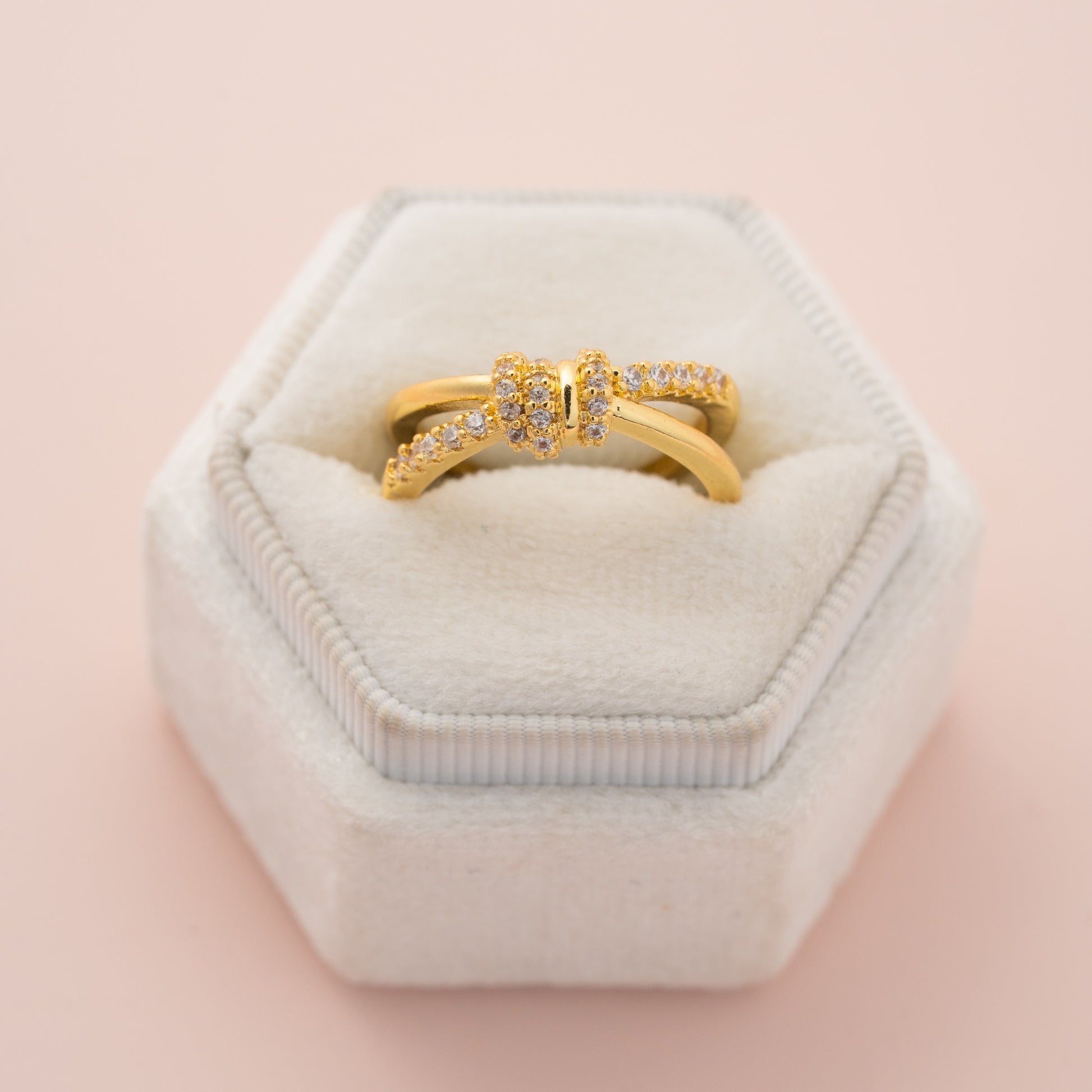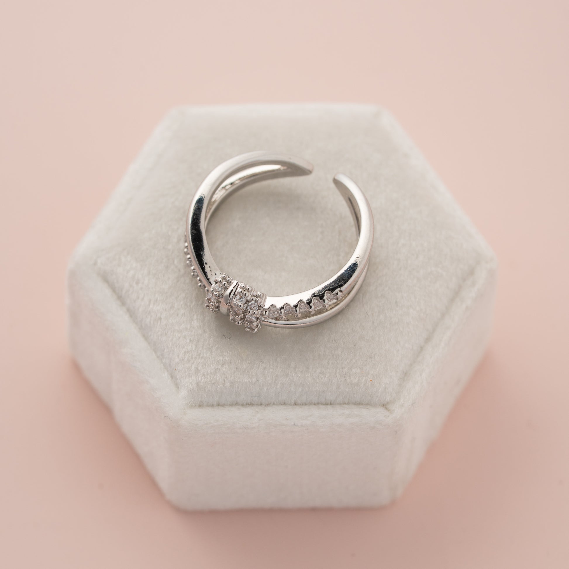 The Kaitlyn is a delicate statement piece designed to catch the light (and compliments) without trying too hard. Featuring a slim open band accented with pavé-style stones and a subtle center detail, this ring gives effortless luxury vibes—perfect for daily wear or dressing up your stack.
