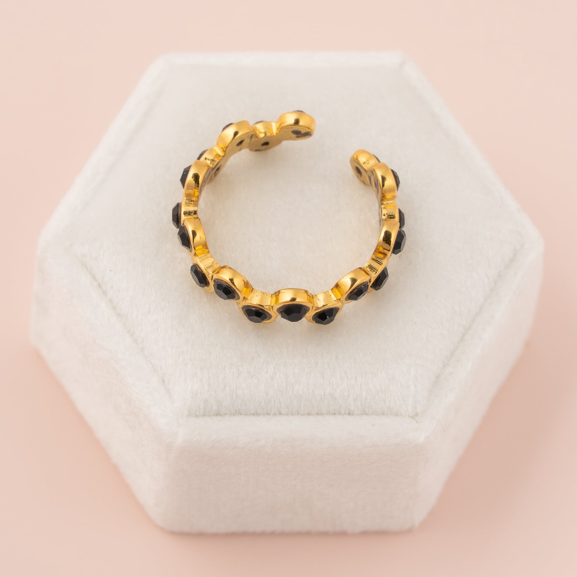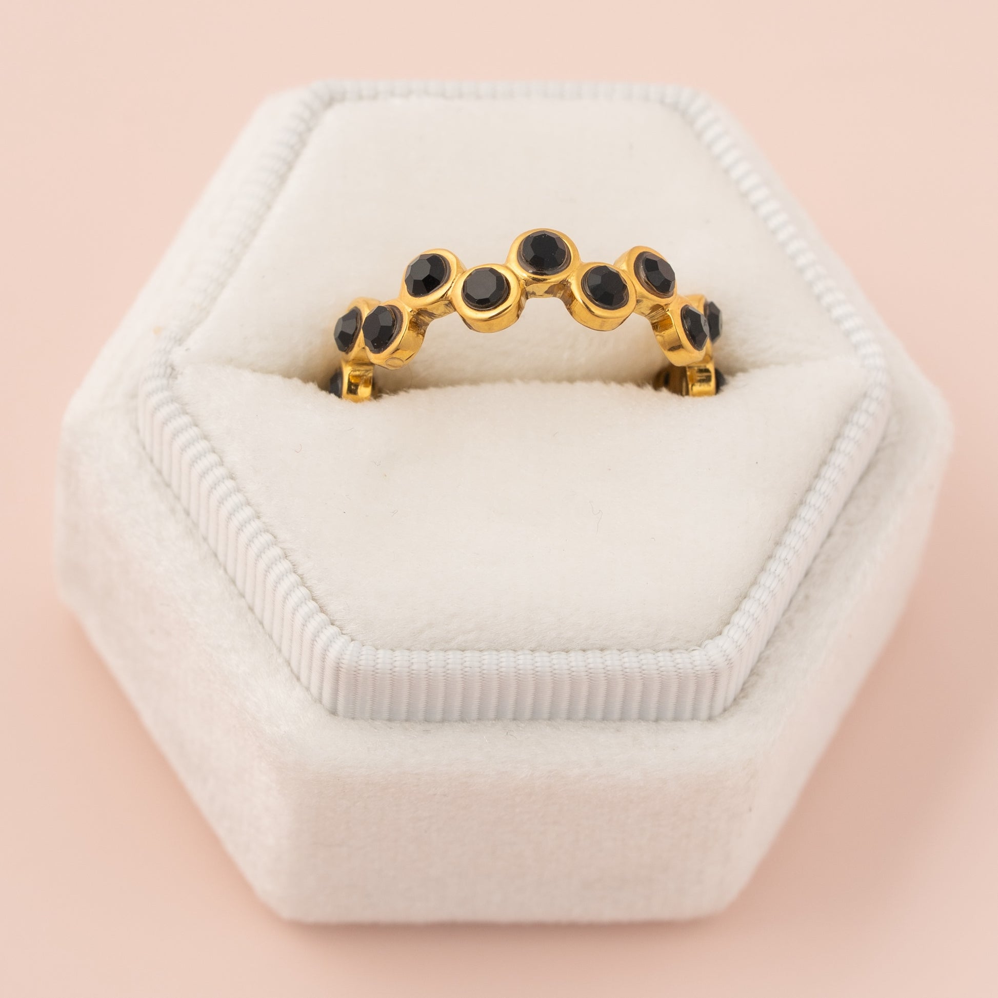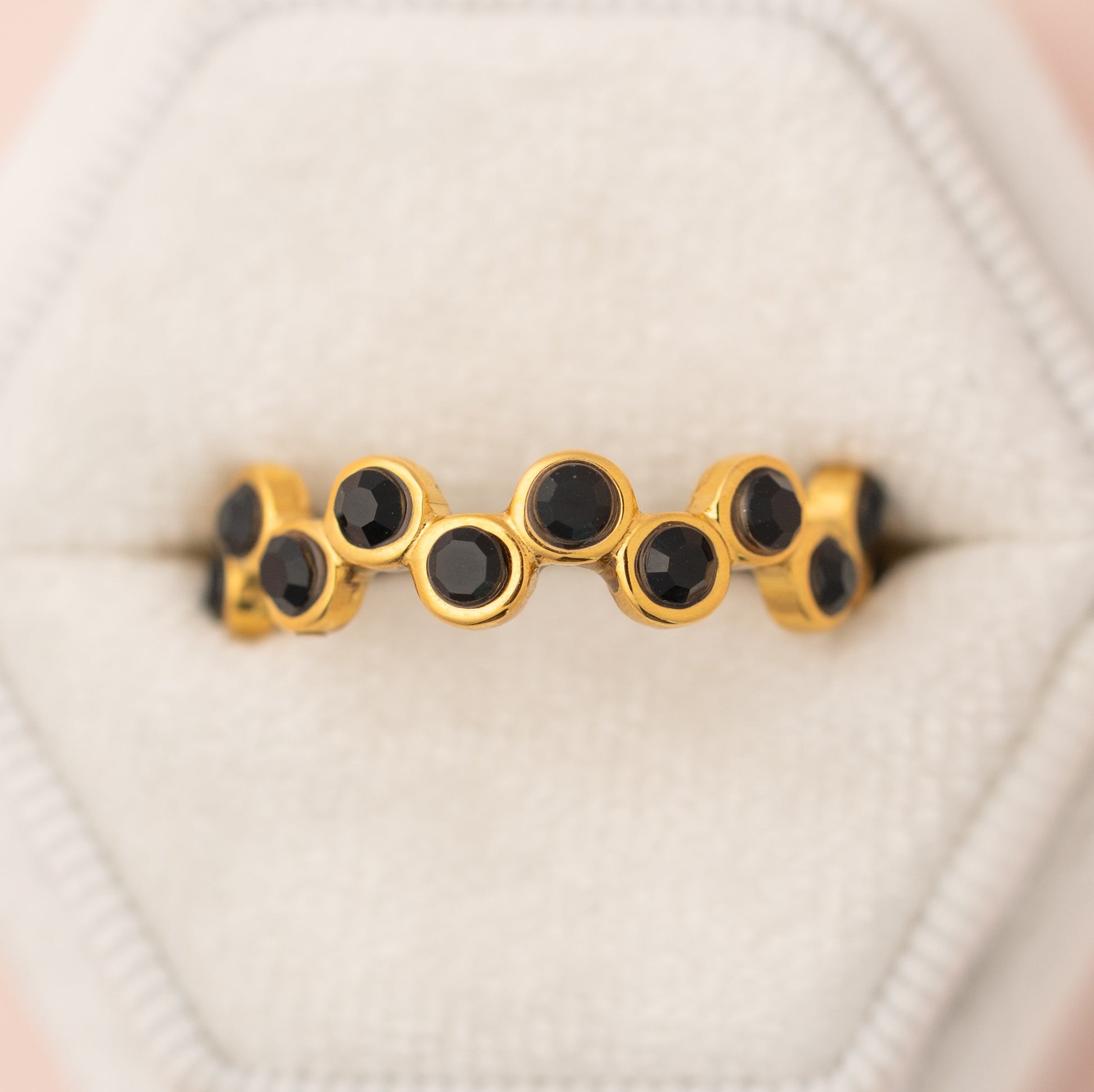 Add a touch of timeless sophistication to your jewelry collection with this stunning gold ring featuring sleek black onyx stones. Crafted with a warm, polished gold setting, this ring showcases a unique, modern silhouette with alternating round bezels that create a rhythmic, eye-catching design. The faceted black onyx gems provide a striking contrast against the gold, making it perfect as a standalone statement piece or stacked with your favorite rings for a bold, layered look. Whether you're dressing up or down, this ring brings refined elegance to any ensemble.